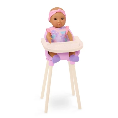 - Includes: Baby doll, fully assembled high chair, attachable food tray, 2 food plates, fork, spoon, 3 food jars, 2 food bags, 2 toy food clusters, bib, baby bottle, baby wipe container, onesie, headband, socks, washcloth, mealtime chart, and stickers.