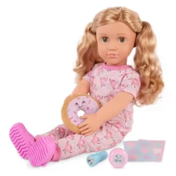 - 18-inch Doll: bright blue eyes that open and close with long brown hair in pretty pigtails that’s fun to style!