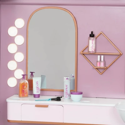 Make pretend-play styling fun with this Our Generation Hair Salon Playset for 18″ Dolls. Fold open the trailer and invite your customers for fun hair makeovers. Shampooing your dolls is sure to be a whole lot of fun when you’re at the washing station as the sink hose extends. You can even light up the mirror as you create fun looks with the hairbrush and curling iron. The shelves and opening drawer come handy for keeping accessories tidy and allows for a quick cleanup. This playset comes with 3 hair clips, hair dryer, 4 pretend nail polish bottles, hair pick, brush, a curling iron, comb, scissors, mirror, 3 dye tubes, shears, nail brush, towel, magazine, a chair and 9 hair care items. When it’s time to travel, just fold the trailer and off you go. (Dolls sold separately)